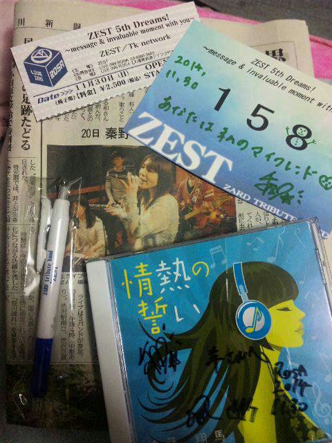 本日の戦利品…ZESTチケ、椅子番号のメッセージカードfrom和さん、ZESTボールペン、翔馬クン&和さんサイン入りCD。そして神奈川新聞。